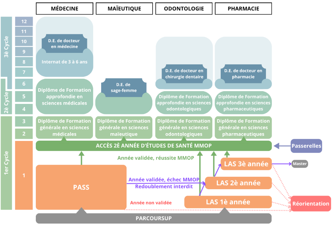 - le parcours spécifique « accès santé » dit « PASS », pilotée par les composantes santé des universités, est une année de licence spécifique comprenant majoritairement des enseignements en santé (« majeure santé ») complétés par une « mineure » d'une autre discipline que celle de la santé ;