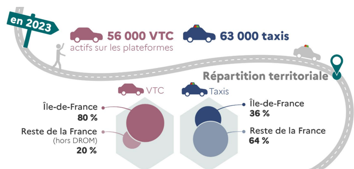 Selon la direction compétente du ministère des transports (DGITM), le nombre d'exploitants inscrits au registre VTC s'établit à 79 149 au 1er octobre 2025, avec plus de 120 000 conducteurs associés. Sur les plateformes d'intermédiation, l'Observatoire des transports publics particuliers de personnes estimait le nombre de chauffeurs VTC actifs à 56 000 en 2023, un nombre qui s'établirait plutôt autour de 70 000 chauffeurs aujourd'hui selon les estimations de la DGITM. Les VTC, désormais plus nombreux que les taxis, font l'objet d'une répartition géographique particulière, avec une concentration forte en Île-de-France.