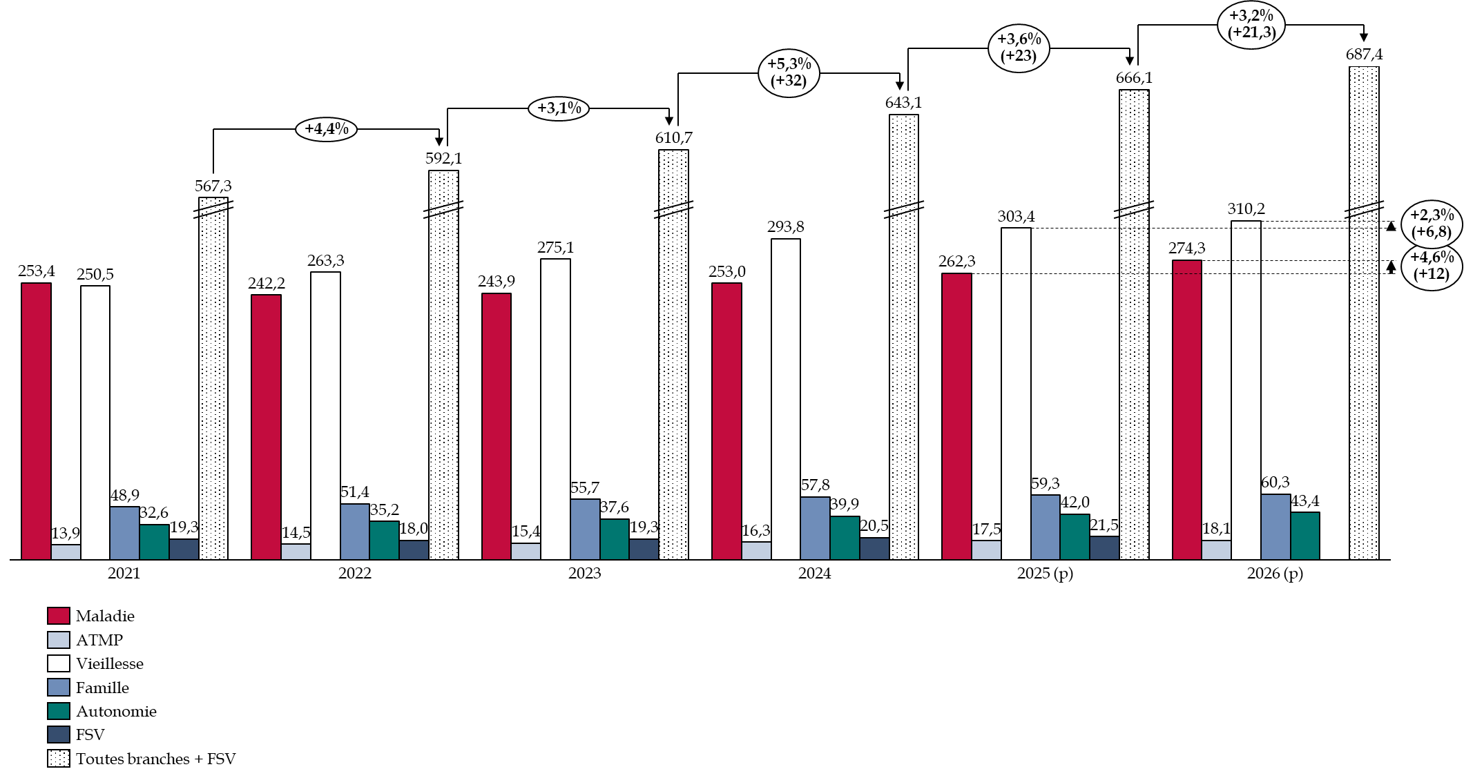 Évolution des dépenses des branches de la sécurité sociale entre 2021 et 2026