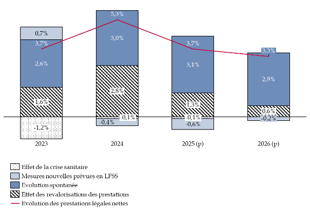 À noter, que depuis 2023, l'évolution des dépenses de la sécurité sociale est très largement liée aux revalorisations des prestations légales nettes servies par la sécurité sociale, en particulier des pensions de retraite. Ainsi, pour 2026, la hausse de 3,3 % du coût des prestations légales est liée pour 0,6 point à la revalorisation des prestations, prévues aux 1er janvier et 1er avril (voir infra). La hausse massive des prestations de 5,3 % entre 2023 et 2024 est très largement liée à la revalorisation de celles-ci, et notamment des prestations de retraites, à hauteur de 2,8 points.