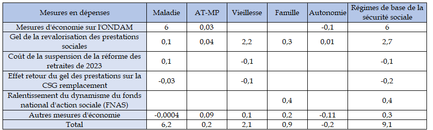 Le ralentissement de l'évolution des dépenses de la sécurité sociale prévu par le PLFSS tel que déposé par le Gouvernement est dû tant à la conjoncture qu'aux mesures d'économies substantielles présentées, pour un montant de 9,1 milliards d'euros. L'essentiel des mesures d'économies initialement envisagées est lié :