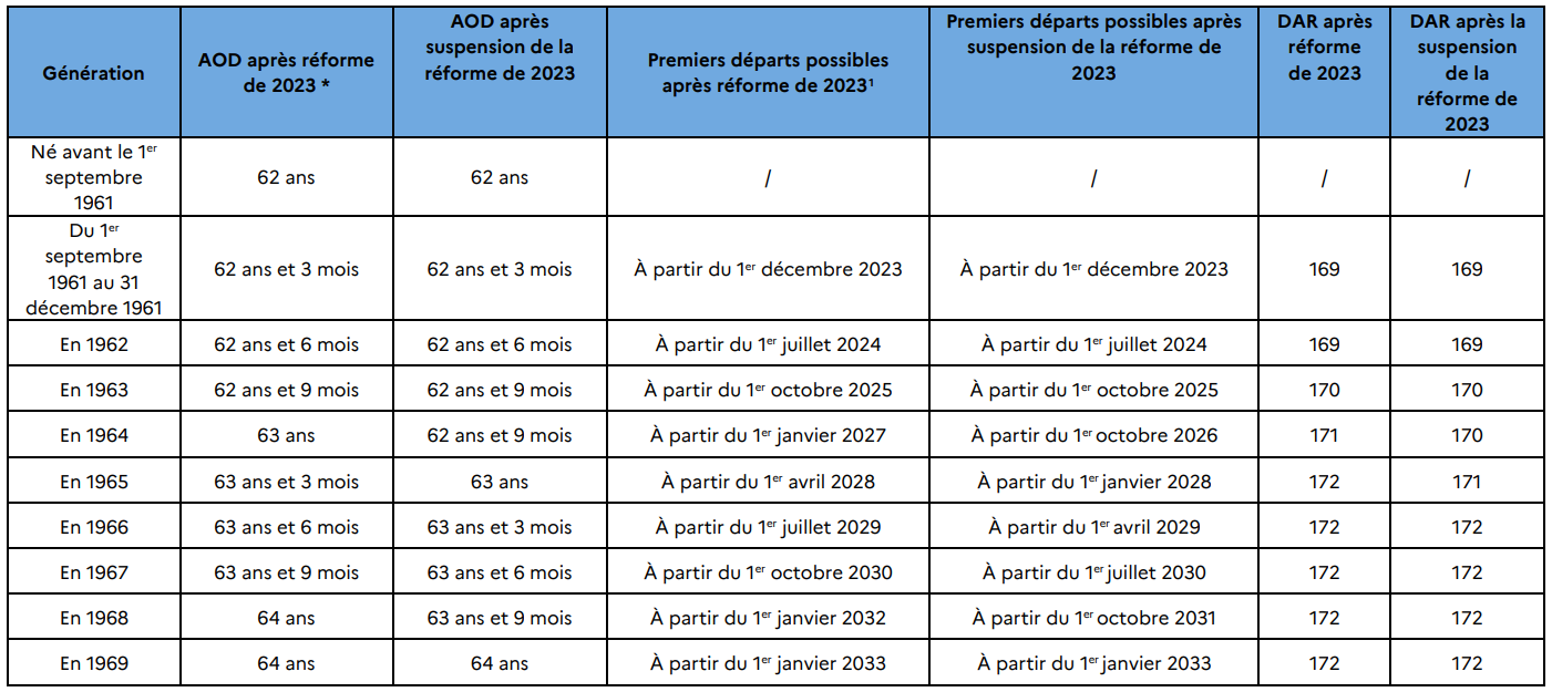 Effet de la suspension de la réforme des retraites sur l'âge d'ouverture des droits (AOD) et la durée d'assurance au régime général (DAR) pour le droit commun