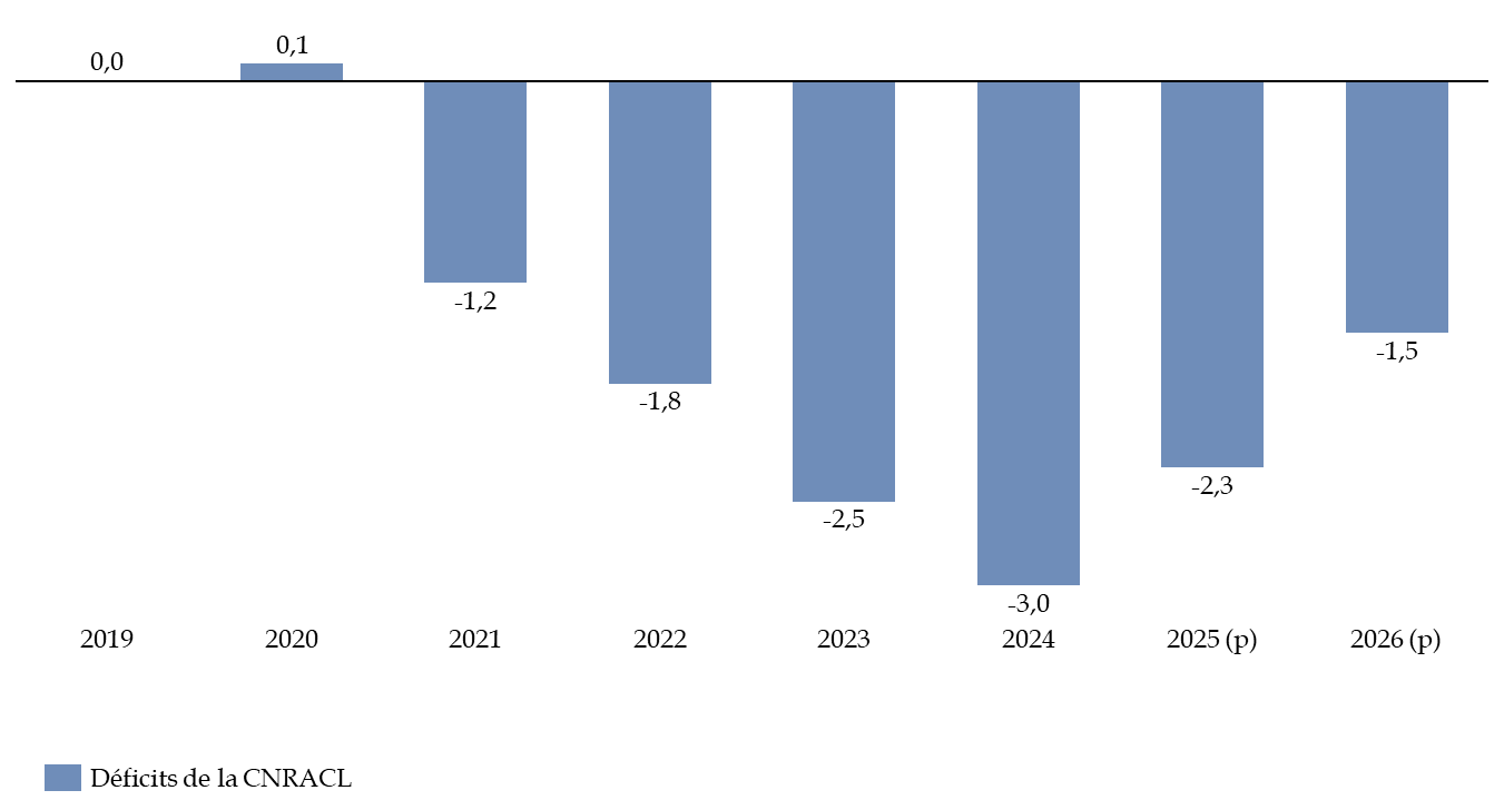 Cette augmentation des cotisations de la CNRACL permet d'améliorer son solde. Alors que le déficit s'élevait à 2,5 milliards d'euros en 2023, et à 3 milliards d'euros en 2024, il devrait diminuer de 0,7 milliard d'euros pour représenter 2,3 milliards d'euros en 2025. En 2026, le déficit de la CNRACL serait contenu, à hauteur de 1,5 milliard d'euros.