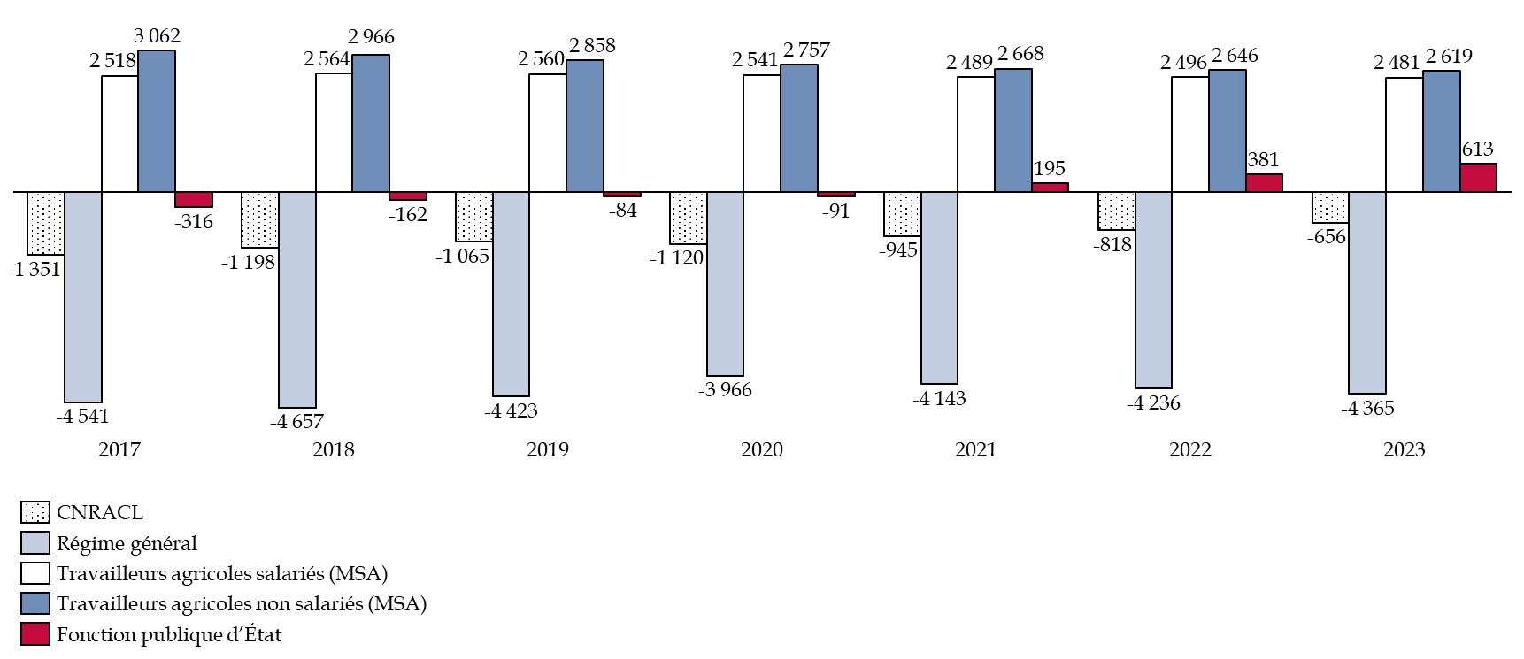 À noter, toutefois, le poids représenté par le mécanisme de compensation démographique ces dernières années pour la CNRACL. Il vise à effectuer des transferts entre régimes, en fonction de la situation démographique relative et de la capacité contributive de ceux-ci. Or la CNRACL est en réalité dans une situation moins dégradée que les autres régimes au vu de ces critères et est donc contributrice à ce titre, jusqu'en 2027. Elle a dû verser près de 100 milliards d'euros constants à ce titre depuis 1974, dont 16,7 milliards d'euros entre 2012 et 2022. En 2023, la CNRACL a ainsi versé 656 millions d'euros, et le régime général 4,37 milliards d'euros au titre de la compensation démographique, alors que le régime des travailleurs agricoles non-salariés a perçu 2,62 milliards d'euros. En 2024, la CNRACL aurait versé encore 533 millions d'euros au titre de la compensation démographique.