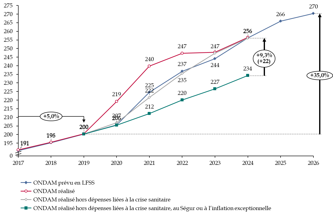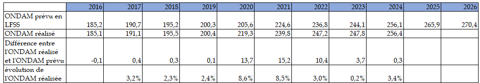 Note : en 2026, l'ONDAM présenté correspond à celui qui a été présenté par le Gouvernement dans le PLFSS déposé initialement à l'Assemblée nationale.
