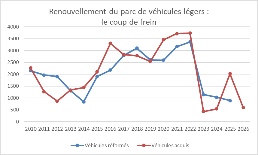 Conséquence : en 2025, plus de la moitié des 26 800 véhicules légers du parc sont maintenus en service alors qu'ils ont atteint l'un des deux critères de réforme (8 ans d'activité ou 200 000 km parcourus).