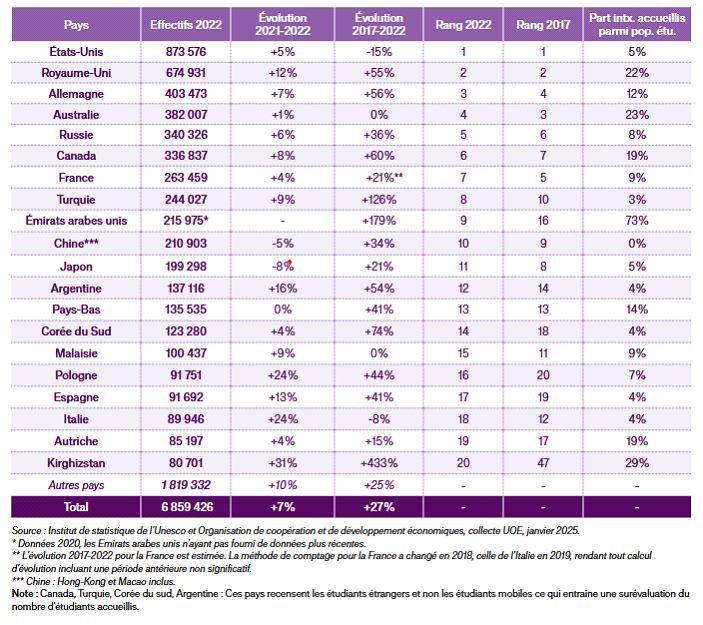 Selon les données de l'UNESCO, en 2022, la France a conservé la 7e place mondiale parmi les pays d'accueil d'étudiants en mobilité diplômante. Elle figurait cependant à la 4e place en 2015.