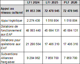 Après une baisse sensible entre 2024 et 2025 (- 11,5 %), les moyens alloués à l'appui au réseau culturel et de coopération à l'étranger (établissements à autonomie financière, instituts français de recherche à l'étranger-unités mixtes des instituts français de recherche à l'étranger, Alliances françaises) sont, à ce stade, préservés (72,5 M€).