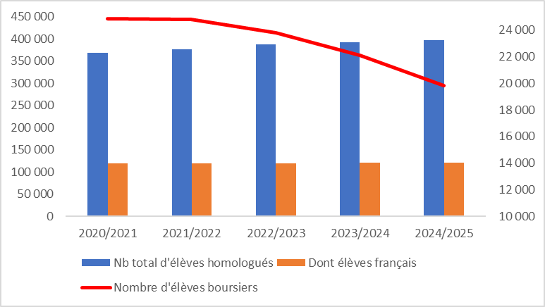 Quoi qu'il en soit, cette baisse marquée accompagne une baisse concurrente du nombre de boursiers dans le réseau AEFE, alors même que le nombre total d'élèves est en augmentation régulière, et que le nombre d'élèves français reste à peu près constant depuis cinq ans.