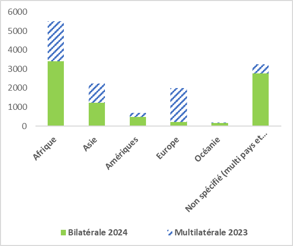 L'APD française, pour des raisons historiques, demeure très liée à l'Afrique, qui constitue de loin la première bénéficiaire, que ce soit au niveau bilatéral ou multilatéral, avec 40 % du total de l'aide française. L'aide apportée par l'Europe empreinte les canaux de l'Union européenne dans le cadre des politiques de cohésion. Les documents budgétaires ne permettent pas d'identifier les bénéficiaires d'une partie significative de l'aide.
