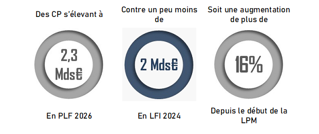 Le projet de loi de finances pour 2026 confirme l'effort consacré à la recherche, à la prospective et à l'innovation de défense, avec une progression significative des crédits du programme 144. 2,8 Mds€ (+ 27 % par rapport aux crédits inscrits en loi de finances initiale pour 2025) sont ainsi inscrits au titre des autorisations d'engagement (AE) et 2,3 Mds€ (+ 10,5 %) au titre des crédits de paiement (CP).