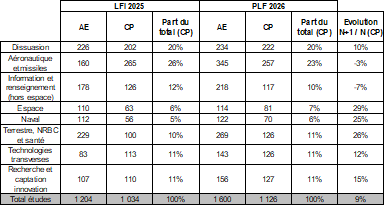 En 2026, les CP consacrés à l'innovation (études amont hors dissuasion et subventions aux opérateurs) s'élèveront à 1,4 Md€, soit une progression de 127 M€ par rapport à la loi de finances pour 2025.