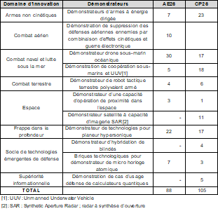 Sur ce montant, 88 M€ en AE et 105 M€ en CP seront consacrés au financement de grands démonstrateurs parmi lesquels : des démonstrateurs d'armes à énergie dirigée, un démonstrateur de drone sous-marin océanique, des satellites à radar à ouverture synthétique et pour les opérations de proximité dans l'espace ou encore un démonstrateur de micro horloge atomique.