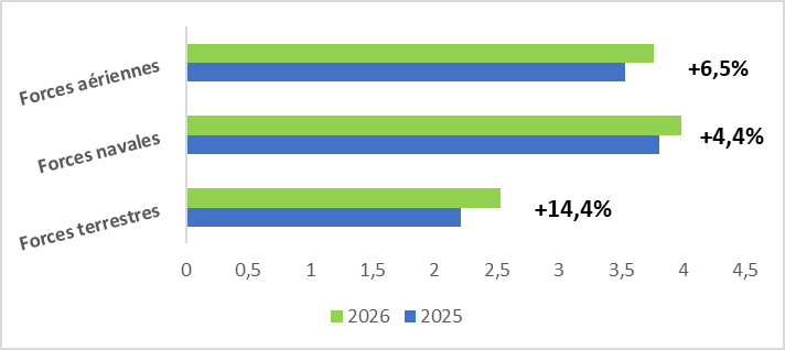 Dans le PLF pour 2026, le programme enregistre une progression de ses crédits de 13,8 % en AE et de 11 % en CP. Il rassemble 28 % des crédits de la mission Défense. |