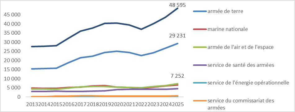 Après un creux dans la dynamique de recrutement consécutif à la pandémie de covid, la tendance est repartie à la hausse en 2023 et, en 2025, les objectifs de recrutement ont été dépassés dès le mois d'octobre, avec 48 595 réservistes opérationnels pour un objectif annuel fixé à 47 600.