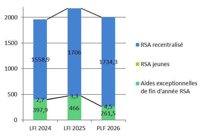 Parallèlement, les dépenses de RSA portées par la mission1(*) diminuent de 8,05 %, de manière équilibrée entre les dépenses liées au RSA qui a été recentralisé dans les départements concernés et les aides exceptionnelles de fin d'année.