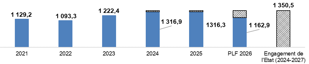 Pour poursuivre le déploiement de la loi du 18 décembre 2023 pour le plein emploi, l'État avait augmenté, dès 2023, la subvention pour charges de service public qu'il verse à l'opérateur. Le Gouvernement s'était également engagé à maintenir le niveau de cette subvention à 1,35 milliard d'euros jusqu'en 2027 conformément à la trajectoire budgétaire prévue par la convention tripartite Unédic-État-France Travail conclue le 30 avril 2024. Si ce montant a bel et bien été voté en LFI 2024 et 2025 conformément à la convention, les crédits effectivement versés sont légèrement moindre après application de la réserve de précaution. Le PLF 2026 dévie pour sa part de la trajectoire convenue puisqu'il est proposé une subvention en diminution de 13,9 % à 1,16 milliard d'euros.