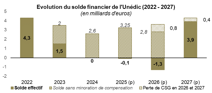 En outre, l'Unédic note que la réforme de l'assiette des cotisations et contributions sociales des travailleurs indépendants entraîne une perte de recettes de contribution sociale généralisée (CSG) affectée à l'Unédic pour un montant que le régime estime à 800 millions d'euros pour l'année 2026, puis 400 millions d'euros par an. Or, cette perte de recette n'avait pas été anticipée lors des prévisions d'excédents ayant fondé l'absence de compensation intégrale des exonérations.
