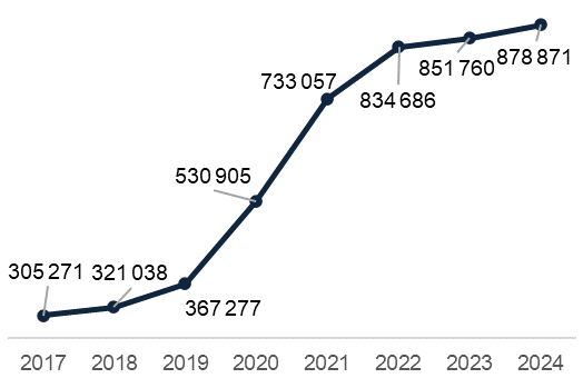 Depuis la loi du 5 septembre 2018 pour la liberté de choisir son avenir professionnel, le nombre de contrats d'apprentissage a augmenté spectaculairement jusqu'à atteindre près de 879 000 contrats en 2024.
