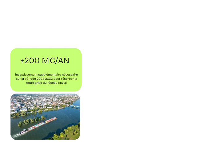 De fait, le développement de ce mode massifié est entravé par l'état préoccupant de ses infrastructures au sortir de décennies de sous-investissement3(*) : en février 2025, la Cour des comptes a estimé à 1,1 Md€ la « dette grise » du réseau fluvial (en 2023), une situation qui se traduit par une perte de fiabilité et des restrictions de navigation. Certes, le contrat d'objectifs et de performance (COP) signé entre Voies navigables de France (VNF) et l'État a prévu une trajectoire d'investissement ambitieuse en faveur du réseau : sur la période 2023-2032, 4,3 Mds€ doivent être consacrés au réseau fluvial, dont 2,5 Mds€ pour la régénération et la modernisation du réseau existant et 1,4 Mds€ pour le développement du réseau grand gabarit, notamment dans le cadre du projet Seine-Escaut.