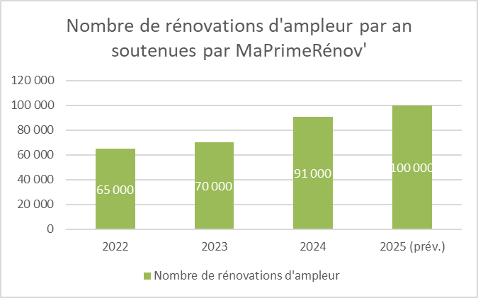 Pourtant, la réforme commence à produire ses effets : un basculement réel vers les rénovations d'ampleur est observé. Environ 100 000 rénovations d'ampleur seront soutenues en 2025 selon les chiffres provisoires communiqués au rapporteur, contre 65 000 à 70 000 dans les années précédant la réforme, soit plus de 30 % de hausse. L'objectif programmatique de 370 000 rénovations globales par an jusqu'en 2030, fixé par la stratégie nationale bas carbone, reste toutefois largement hors d'atteinte.