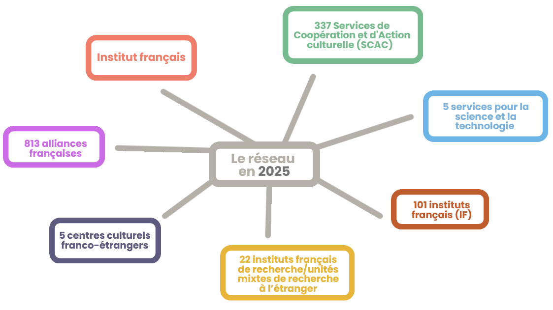 Le réseau des instituts français a été très stable en 2025. Seule la Villa Hegra à Al-Ula en Arabie Saoudite a ouvert ses portes ; trois antennes ont été inaugurées au Canada. Le réseau d'Indonésie a été remodelé. Enfin, seule l'antenne de Yokohama au Japon a fermé.