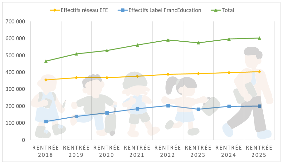 Le réseau d'enseignement français à l'étranger scolarise 403 000 élèves en 2025-2026, contre 398 000 en 2024-2025, soit une légère augmentation de 1,2 %. Le réseau a intégré environ 50 000 élèves supplémentaires entre 2018 et 2025. Cette croissance est principalement portée par les élèves étrangers. Le réseau scolarise désormais 30 % d'élèves français ; 57 % ont la nationalité du pays dans lequel se trouve l'établissement et 13 % ont une nationalité tierce. Cette évolution confirme la plus grande frilosité de nos compatriotes pour l'expatriation familiale depuis la crise sanitaire liée au Covid-19. Les effectifs européens et américains sont en baisse ou en stagnation, tandis que l'Asie connait une hausse régulière, tant des homologations que des effectifs.