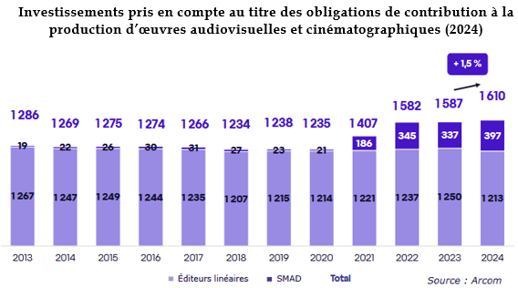 Le cahier des charges5(*) de France Télévisions prévoit que l'entreprise doit consacrer chaque année au moins 420 M€ à la production d'oeuvres européennes ou d'expression originale française. En 2024, France Télévisions a signé avec syndicats de l'audiovisuel un accord pérennisant un apport de 440 M€ par an, montant qu'elle ne pourra honorer en raison des économies qui lui sont demandées. Réaliser davantage d'économies nécessiterait une modification du cahier des charges du groupe. Les économies ainsi réalisées auraient une répercussion immédiate sur le secteur de la création, en termes de croissance, d'emploi, de rentrées sociales et fiscales, etc. En 2024, d'après l'Arcom, le groupe France Télévisions est le premier contributeur, représentant 35 % des dépenses de production d'oeuvres audiovisuelles en France.
