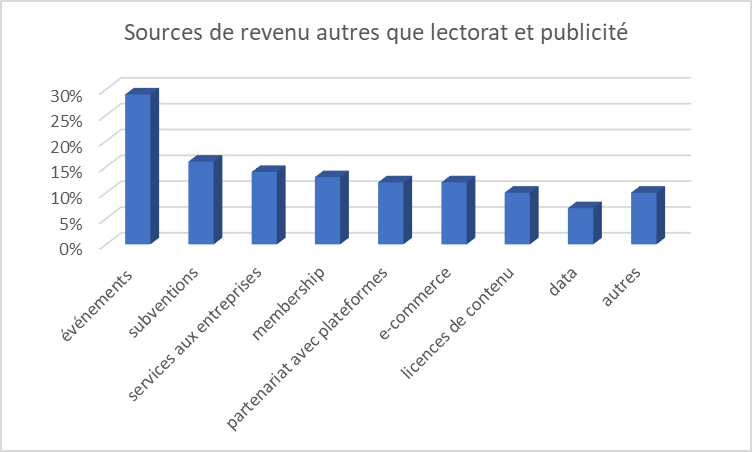 Pour faire face à cette tendance baissière, certains éditeurs adoptent une stratégie de diversification, en développant des activités dans l'événementiel, les services aux entreprises ou encore les activités d'agence de communication, de traitement ou d'exploitation des données. Selon l'Alliance pour la presse d'information générale (APIG), la diversification représente déjà en moyenne 20 % des revenus des journaux imprimés en France. Certains groupes de presse ont particulièrement investi cette stratégie de diversification. À titre d'exemple, le groupe Le Télégramme réalise un chiffre d'affaires annuel de plus de 200 millions d'euros dont près de la moitié ne provient pas de ses activités de média (organisation de festivals, détention d'un site d'offres d'emploi, etc.).