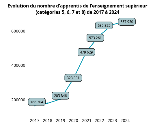 Le nombre d'apprentis dans l'enseignement supérieur a connu une croissance spectaculaire depuis la réforme de 2018, passant de 180 000 en 2018 à 635 925 en 2023 - soit une croissance de 253 % en cinq ans. Selon la revue des dépenses publiques d'apprentissage et de formation professionnelle réalisée en mars 2024 par l'inspection générale des finances (IGF) et l'inspection générale des affaires sociales (Igas), cette croissance est principalement portée par les écoles de commerce et les « autres formations privées », dont le nombre d'apprentis a respectivement augmenté de 112 % et de 141 % entre 2020 et 2022 (contre 21 % dans les écoles d'ingénieur).