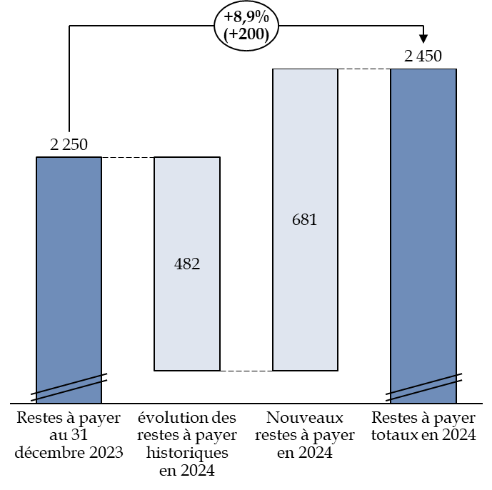 La mission « Outre-mer » est marquée par l'importance des restes à payer, qui correspondent souvent à des dispositifs ayant vocation à être consommés pendant plusieurs années. Ils s'élèvent en 2024 à 2,4 milliards d'euros, en hausse de 9 %, représentant 200 millions d'euros, par rapport à 2023. En effet, si près de 482 millions d'euros des restes à payer des années précédentes ont été exécutés, ce sont 681 millions d'euros de nouveaux restes à payer qui ont été générés cette année.