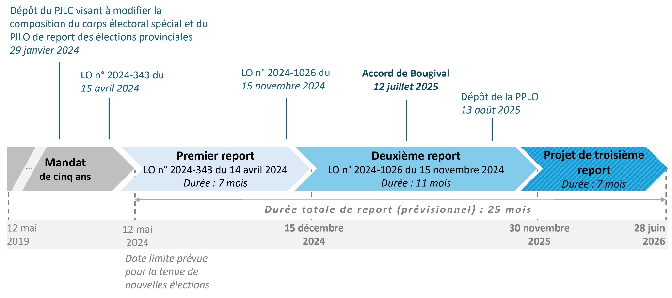 - automne 2025 : adoption de la loi organique reportant les élections provinciales à juin 2026 et adoption du projet de loi constitutionnelle modifiant le titre XIII de la Constitution ;