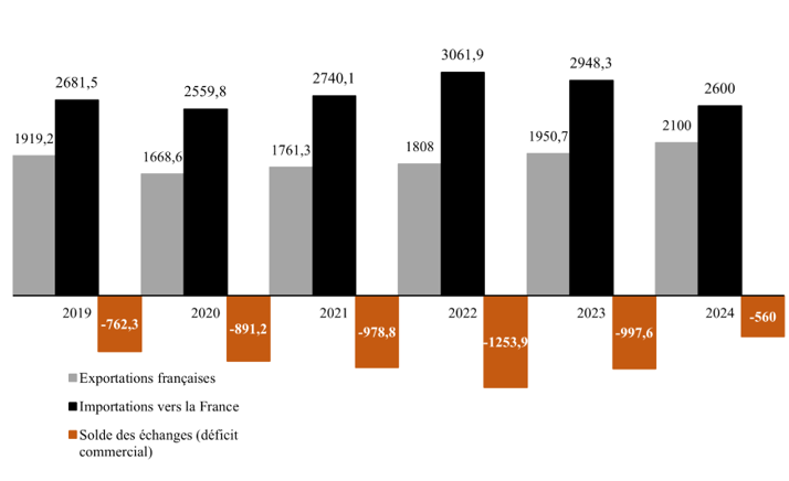 La balance commerciale de la France avec la Finlande était déficitaire en 2023, avec un solde négatif d'environ un milliard d'euros : les importations françaises depuis la Finlande ont atteint 2,9 milliards d'euros, contre 1,9 milliard d'euros d'exportations. Ce déficit commercial s'explique principalement par trois grands secteurs : le bois, le papier et le carton ; les équipements mécaniques et le matériel électrique ; ainsi que les produits métallurgiques et métalliques. On note néanmoins une amélioration du déficit commercial de la France vis-à-vis de la Finlande en 2024, passant d'un milliard à 560 millions d'euros, porté à la fois par une baisse des importations (2,6 milliards d'euros, - 11 %) et une hausse des exportations (2,1 milliards d'euros, + 7 %).
