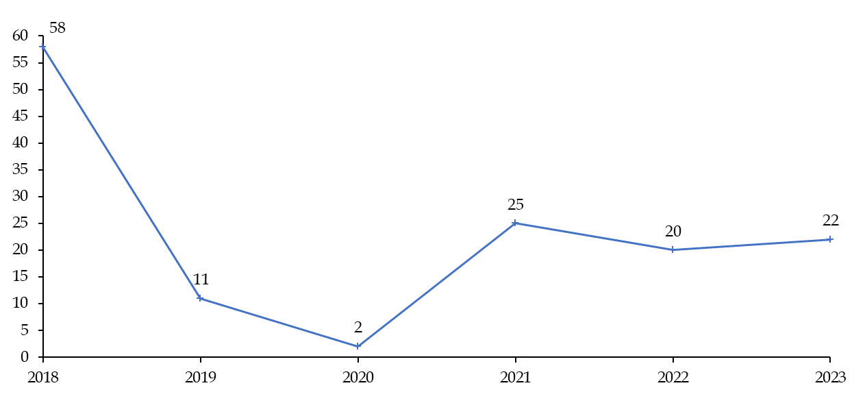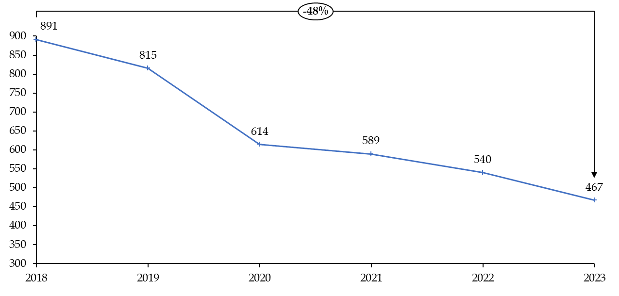 La fraude au prélèvement représente en 2023 un montant total de 22 millions d'euros pour 78 000 opérations frauduleuses, soit une moyenne de 300 euros pour les prélèvements concernés17(*). Le montant de la fraude au prélèvement connaît de fortes variations annuelles et il a été réduit à hauteur de 62 % entre 2018 et 2023 selon les données de l'OSMP.