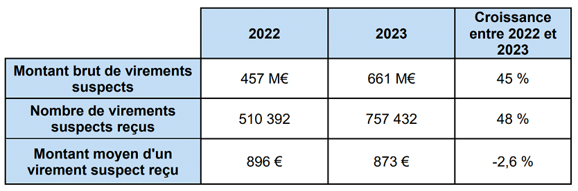 D'après une enquête menée par l'Autorité de contrôle prudentiel et de régulation (ACPR) et publiée en juillet 2025, 661 millions d'euros de virements reçus ont été identifiés « a minima comme suspects » par les organismes financiers interrogés en 2023, en progression de 45 % sur un an43(*). Le montant moyen des virements suspects reçus, lui, resterait stable, à un niveau légèrement inférieur à 900 €.