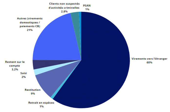 Seuls 9 % de ces flux ont été restitués aux victimes dans le cadre d'un rappel et 2 % saisis par les autorités, tandis que 3,2 % d'entre eux sont restés sur les comptes concernés à la fermeture.
