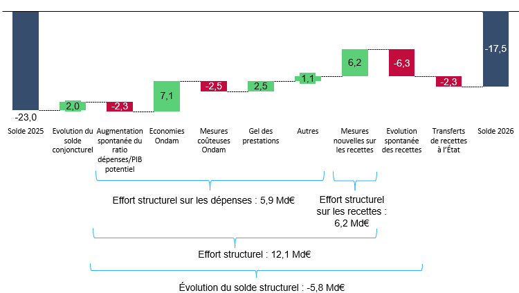 Solde 2025 : PLFSS pour 2026. Soldes conjoncturel et structurel calculés par la commission des affaires sociales d'après les estimations du PIB potentiel de la Commission européenne (mai 2025). Économies et mesures coûteuses Ondam : annexe 5 au PLFSS pour 2026 (cela intègre des mesures antérieures au PLFSS et à ses textes associés). Impact de la réforme des retraites : rapport à la commission des comptes de la sécurité sociale d'octobre 2025. Mesures nouvelles sur les recettes : rapport à la commission des comptes de la sécurité sociale d'octobre 2025 (mesures hors PLFSS) et annexe 3 au PLFSS pour 2026 (mesures PLFSS).