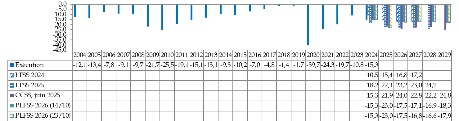 NB : Afin de faire apparaître l'effet du décalage de la réforme des retraites de 2023 et de son financement, on indique, s'agissant du PLFSS pour 2026, la trajectoire prévue par le texte déposé le 14 octobre, et celle prévue par le texte résultant de la lettre rectificative du 23 octobre.