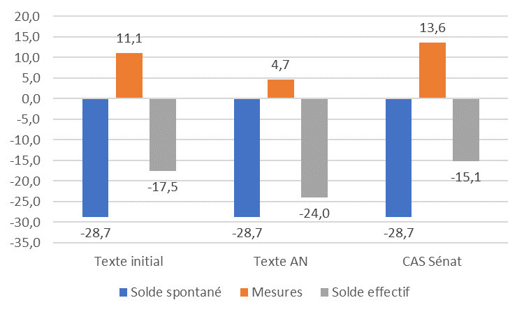 * 94 Il s'agit des coûts résultant de l'extension de la mesure aux départs anticipés figurant dans le texte transmis au Sénat. Les coûts du texte résultant de la lettre rectificative étaient de 0,1 milliard d'euros en 2026 et 1,4 milliard d'euros en 2027.