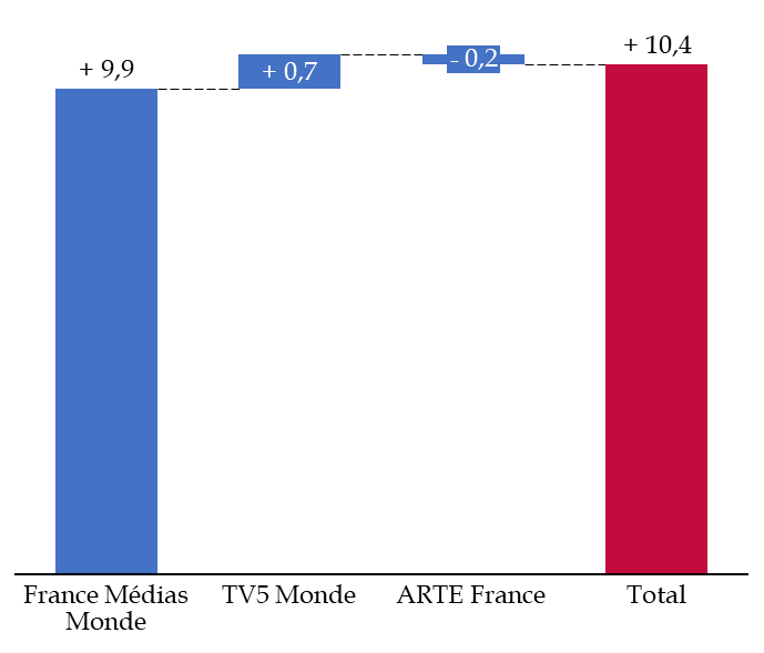 Pour cette raison, 9,9 millions d'euros devraient être versés à France Médias Monde, sur la hausse de 10,4 millions d'euros prévue par le présent article.