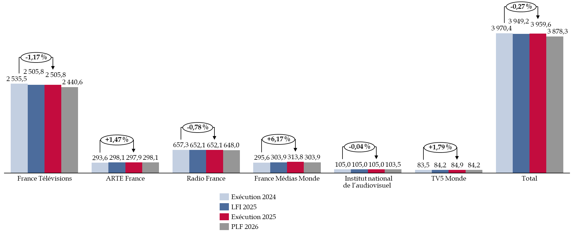 Le montant total versé à l'ensemble des sociétés d'audiovisuel public en 2025 serait de 3,959 milliards d'euros, soit un montant quasiment stable par rapport à l'exécution 2024 (- 0,3 %).