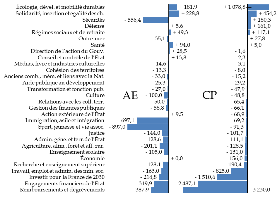 Au niveau des missions, les annulations de crédits de paiement les plus importantes portent sur des crédits non pilotables, à savoir ceux des missions « Remboursements et dégrèvements » (- 3,2 milliards d'euros) et « Engagements financiers de l'État » (- 2,5 milliards d'euros), ainsi que la mission « Investir pour la France de 2030 » (- 1,5 milliard d'euros). La principale ouverture de crédit revient à la mission « Écologie, développement et mobilité durables » (+ 1,1 milliard d'euros). Ces mouvements seront présentés par programme budgétaire infra.