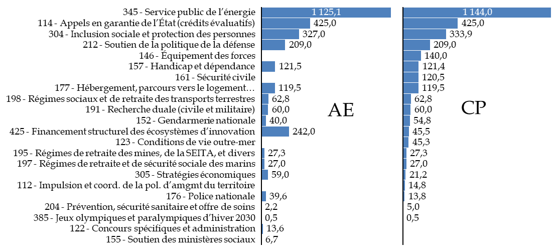 - le programme 345 « Service public de l'énergie » de la mission « Écologie, développement et mobilité durables » (+ 1,1 milliard d'euros), à cause de la réévaluation à la hausse, dans une délibération de la Commission des régulations de l'énergie (CRE) de juillet dernier, des compensations de charges de service public de l'énergie dues par l'État au titre de l'année 2025 ;