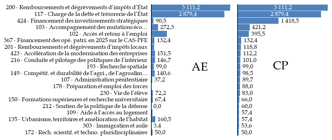 - le programme 114 « Appels en garantie de l'État » de la mission « Engagements financiers de l'État » (+ 425,5 millions d'euros), « au titre », selon le projet de loi de finances de fin de gestion, « de la sinistralité attendue des prêts garantis par l'État en 2025 » ;