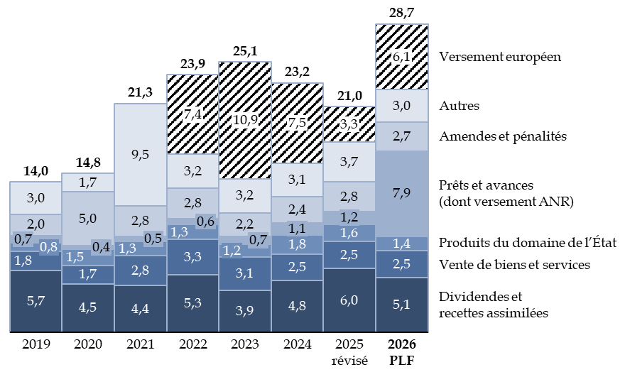Les recettes non fiscales s'établiraient en 2026 à 28,7 Mds€, en hausse de 5,5 Mds€.