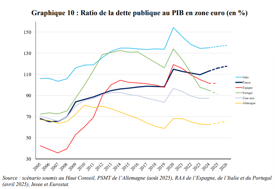 Le HCFP souligne de même dans son avis sur le PLF 2026 que « l'écart entre les ratios d'endettement de la France et de l'Allemagne dépasse désormais 50 points de PIB, alors qu'ils étaient au même niveau il y a vingt ans ».