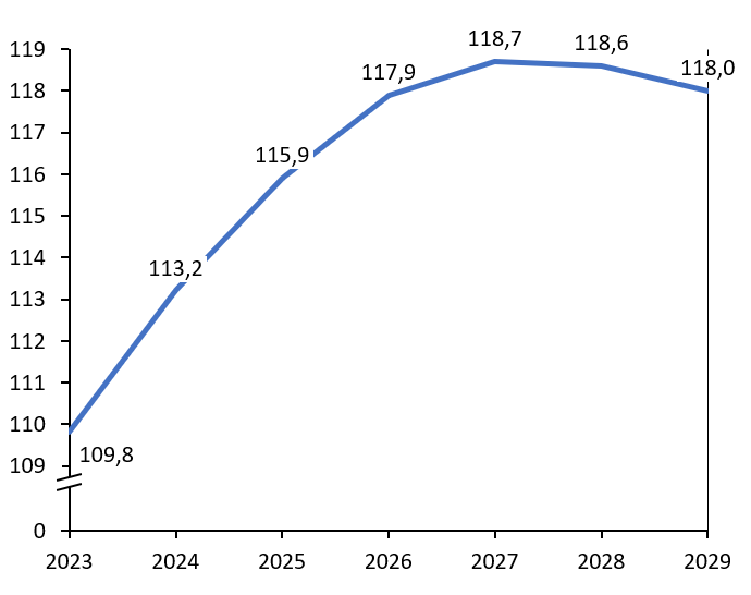 Le ratio ne redescendrait ensuite que très lentement, à 118,6 % en 2028, puis 118 % du PIB en 2029, soit une proportion du revenu national toujours significativement plus élevée qu'en 2025, et plus encore qu'en 2024 (113,2 %).