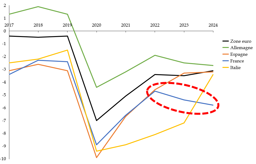 Il en résulte pour la France un déficit atteint en 2024, de - 5,8 %, complètement inédit hors période de crise.