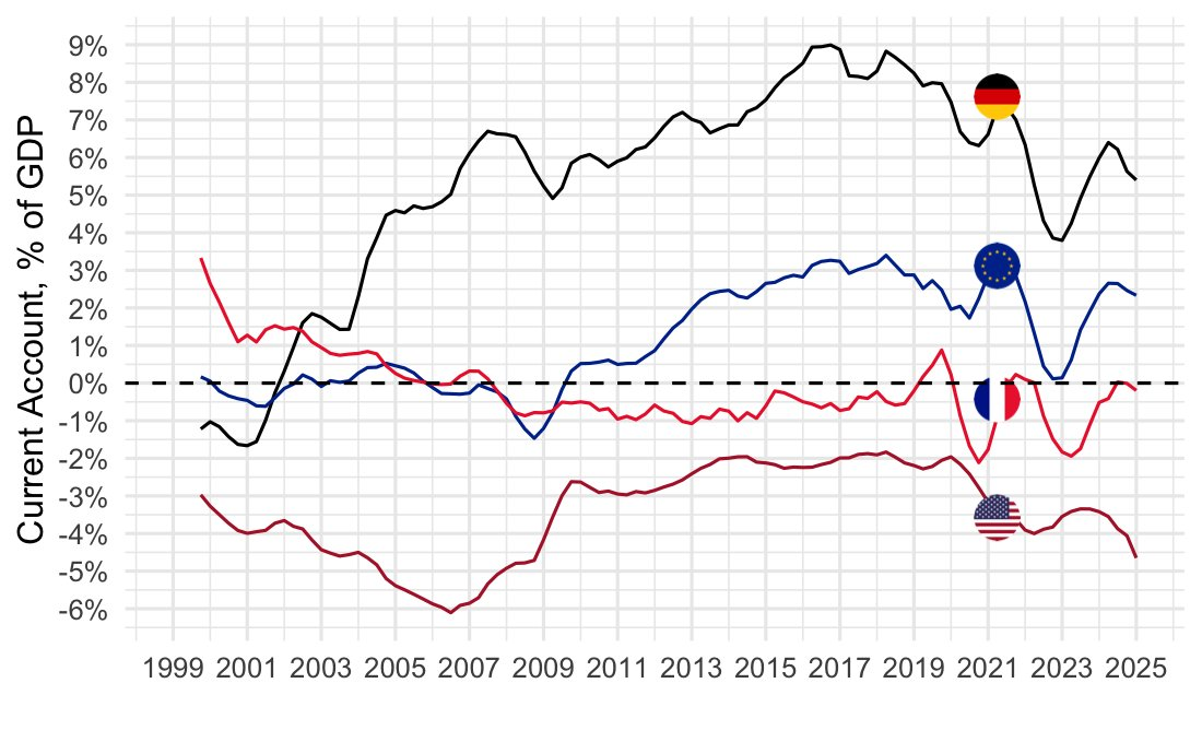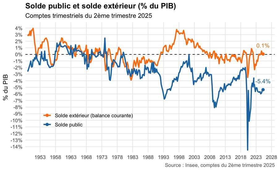Solde public et solde du compte courant (en % du PIB, jusqu'au T2 2025)