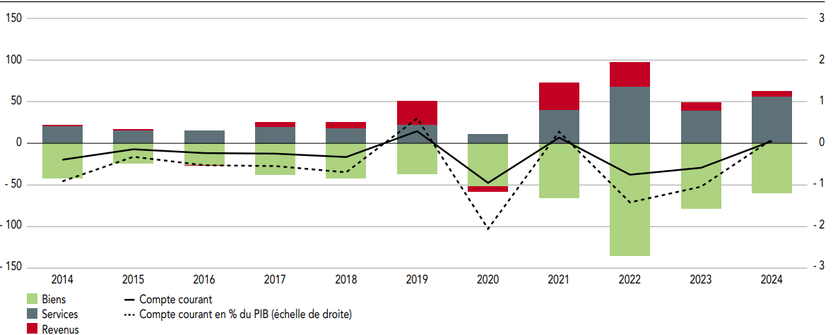 Or, les données publiées mi-2025 par la Banque de France portant sur l'année 2024 font apparaître qu'à la faveur d'une amélioration de son solde des biens consécutive à la sortie de crise énergétique et de son solde des services en raison de services aux entreprises en hausse, la France connaît un équilibre de sa balance courante (excédent de 3 milliards d'euros). En détail, un excédent dans les services (+ 57 Md€) et dans les revenus (+ 6 Md€) fait plus que compenser un déficit commercial (- 60 Md€).